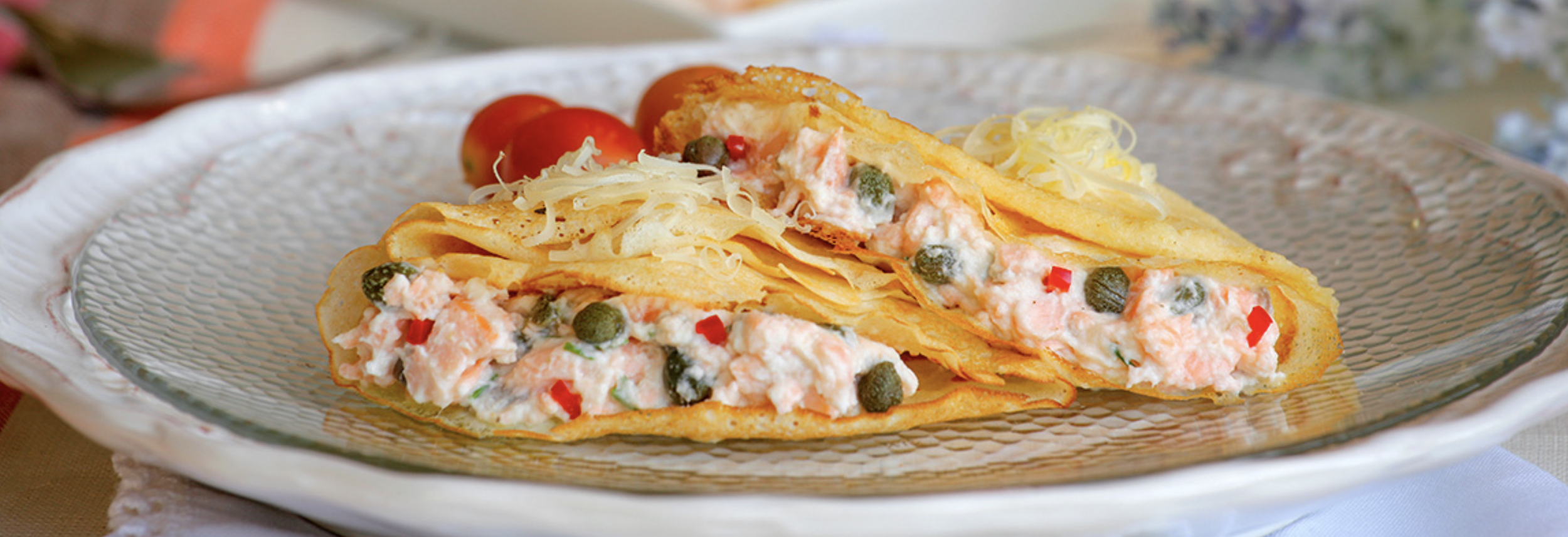 Encha com duas colheres generosas de mistura de salmão cada panqueca e dobre como um pano.