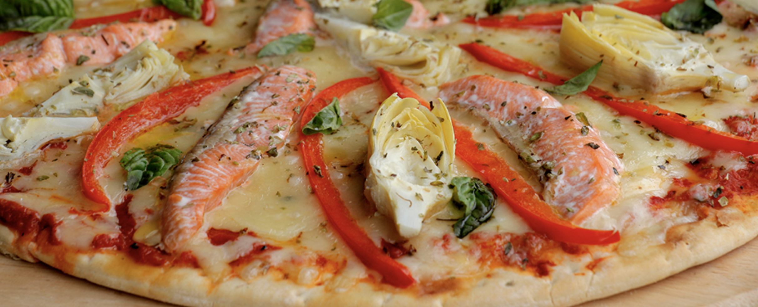 Unir os corações das alcachofras divididas, distribuir o pimentão em juliana, e os filés de salmão.